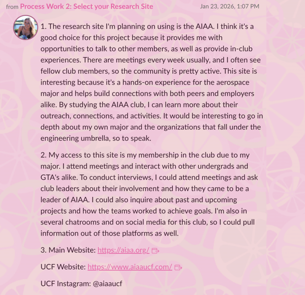 The main social media platform I examined was the UCF AIAA chapter’s Instagram page. It’s a page full of information on events, deadlines, and volunteering opportunities. It hasn’t been as active this semester in terms of posts, but in previous fall semesters, it’s been regularly updated. The page is a good representation of how AIAA represents itself to nonmembers. It shows the community activities that define discourses, such as highlighting meeting events, volunteer updates, and general interaction between members. Comments and tags also show participation in the events by members, strengthening the argument that AIAA is a well-rounded and involved community. The images used also help me develop ideas based on purposeful branding and engagement that I don’t receive from chat servers.