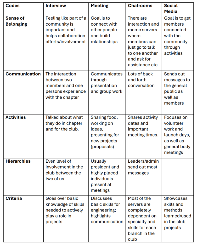 Firstly, the interview was helpful towards my research and pushed development in discerning communication practices within the site. It was nice to gain an outside perspective on interactions between members and how this communication is perceived. It connects well to my analysis of social media page interactions and may provide further understanding towards those interactions. While it would’ve been nice to get the opportunity to interview a member who has more experience, this time spent wasn’t wasted and provided a solid perspective on how members begin building relationships within the chapter.